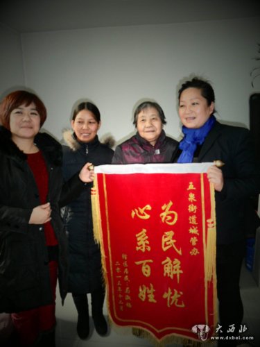 昨日上午, 73岁的马淑梅奶奶在儿媳妇的陪伴下将写着“为民解忧,心系百姓 ”的锦旗送到了五泉街道城管办张主任手中,衷心感谢街道城管办帮她解决了困扰自己数月的居住环境噪音问题。马奶奶激动的说:“ 五泉街道这些年来为辖区内居民解决了很多难事、急事,特别是老旧楼房的整修,社区路面硬化等等。让居民们都感到街道社区是个温暖的大家庭。这次街道城管办又帮我这么大的忙,真是太感谢了。张主任忙里忙外,就像我的亲闺女似的。”