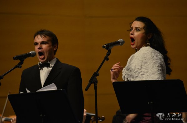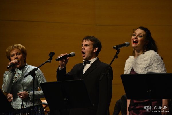 俄罗斯国家一级演员斯尔盖.里哈巴耶瓦,阿娜塔斯亚同台演唱中俄歌曲。 贾笑云 摄