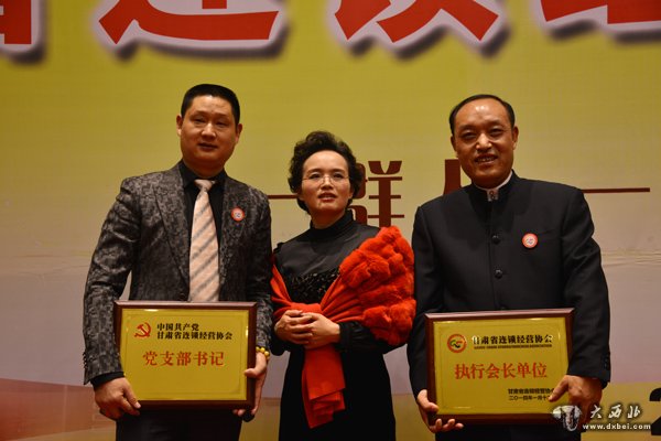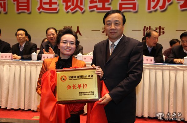 甘肃省副省长郝远为新当选的甘肃省连锁经营协会会长张芳萍授牌。 贾笑云 摄