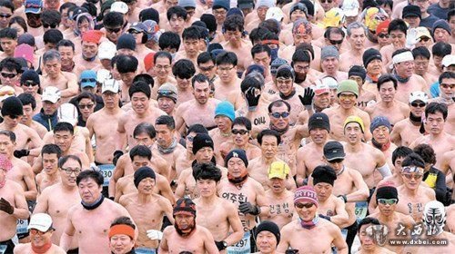 据报道,韩国大邱经常举行裸体马拉松活动,2010年,该市为了祝福2011年世界田径锦标赛在大邱市成功举行,曾召集400多名韩国马拉松爱好者参加裸体马拉松活动。
