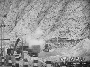 1月18日下午3时许,记者采访路过309国道榆中县巴石沟,进入山沟,同车的几名同事突然惊叹起来:“这里的山上怎么都像涂脂抹粉一样,地里、山上、路上,连石头都是白色的?”答案就在巴石沟内的采石场内,记者一行沿途发现,采石场均未见到防尘设施,大堆的砂石露天堆放着,风一吹,石粉像袅袅青烟一样升起、弥漫。一家石料场,装载机正在往翻斗车内装载砂石,扬起的粉尘弥漫了整个车体和采石场大半个场地。路上和山上积落的正是这种白色的石头粉末。