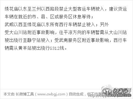 大西北网2月18日讯,截止今日7点30分我省庆阳、泾川、乌鞘岭路段仍为小雪天气,马营梁、大山川路段有雾,其余路段天气阴。受近日降雪影响,绣花庙以东路段路面湿滑,弯道、背阴、隧道出入口路段有积雪结冰。其中,绣花庙路段结冰较严重。为了您的行车安全,积雪结冰路段分车型实施临时管控,详情如下: