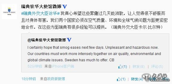 据京华时报报道,北京市气象台称从2月20日开始的雾霾将在2月27日结束,而瑞典外交大臣访华的时间为2月21日到2月26日,正好处于雾霾天。