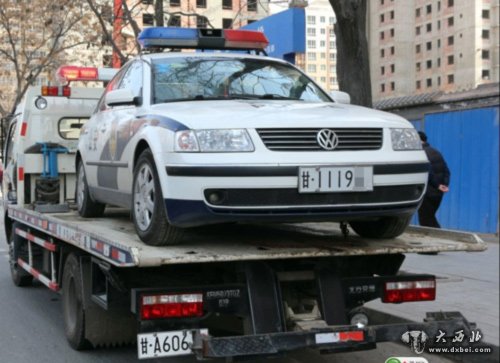 大西北网讯 昨日下午15时许,记者路过东方红广场时发现,几位交警正在主席台前整治乱停乱放。在交警整治的对象当中,赫然停着一辆警车。对此,交警并未犹豫,而是将违规停靠在主席台前的警车拖走。