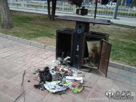 大西北网4月9日讯,4月9日9时许、兰州黄河边人行道上一个垃圾箱不知被啥人给烧了! (责任编辑:鑫报)