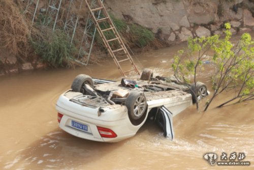 事故现场位于兰州市图书馆西侧、金雁大桥南侧的南河道内,一辆悬挂甘AM6887号牌的白色奔驰牌小轿车翻倒在6米多深的河道中,河堤上一棵直径约10余厘米粗的树被撞断。记者赶到现场时,现场围观群众很多,秩序比较混乱,东岗交警大队的民警正在维护交通秩序。
