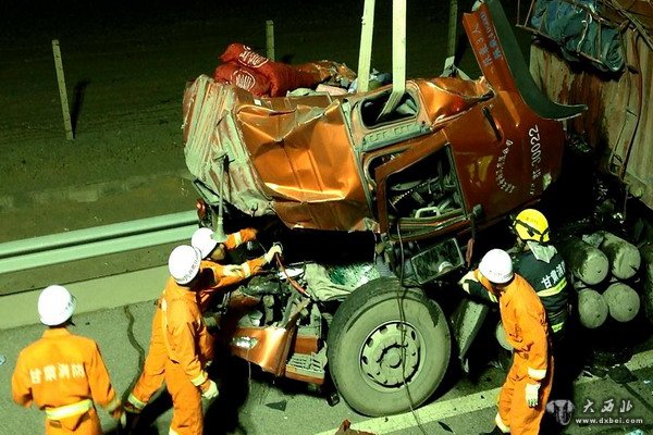 事故发生后,酒泉消防支队接到报警,调集辖区瓜州消防中队官兵到达事故现场实施救援。消防、医疗部门同时赶到事发现场后看到,两辆半挂货车追尾,后方车辆车牌号为“甘F30022”,整个车辆驾驶室完全变形,零碎不堪,驾驶员被挤在驾驶位置处,经医护人员鉴定,该驾驶员已无生命迹象。因尚不确定驾驶室内是否还有其他随行人员,消防官兵利用消防破拆器材立即对驾驶室实施破拆,几分钟后,将驾驶员遗体取出交由医护人员处理。在消防官兵对变形严重的驾驶室内反复进行搜寻后,确定再无其他随行人员被困,才撤离事故现场。截止凌晨3时40分左右,现场救援结束。