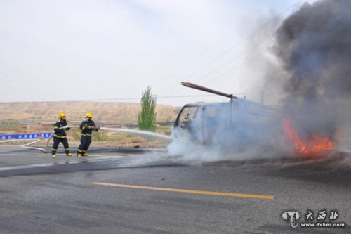 中队官兵到现场后发现,一辆车牌号为甘ADN906的小型卡车着火,现场浓烟滚滚,火势正处于猛烈阶段,车身已被大火吞噬。如不及时控制火势,大火一旦将油箱引燃,后果将不堪设想。现场指挥员根据现场情况,立即下达作战命令,战斗一组负责对现场进行警戒,战斗二组单干线迅速出一支水枪对油箱部位进行冷却,并对汽车着火部位进行压制、灭火。经过官兵大约5分钟的紧张扑救,现场明火终于被扑灭,由于车辆引擎盖内无法用水枪进行直接打击,指挥员立即命令战斗二组使用撬棒、铁挺等破拆工具撬开引擎盖,用水枪对汽车引擎盖内进行冷却降温,防止复燃。中队官兵在仔细检查车体情况,确保无复燃可能后,收整器材,于16时34分返回中队。