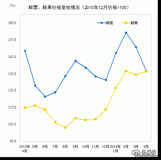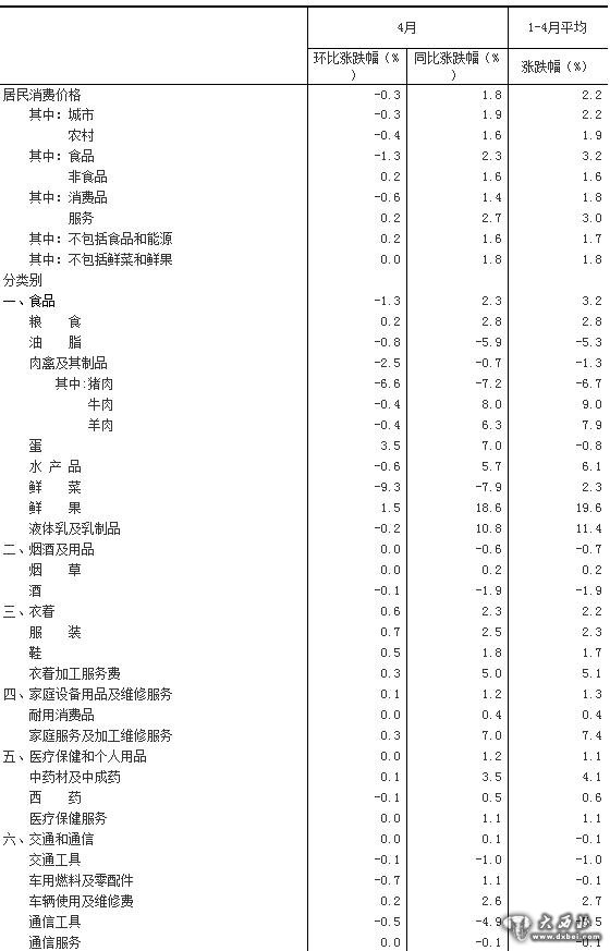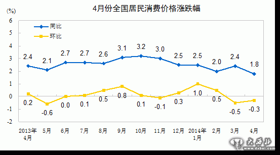 原标题:统计局:2014年4月CPI同比上涨1.8%