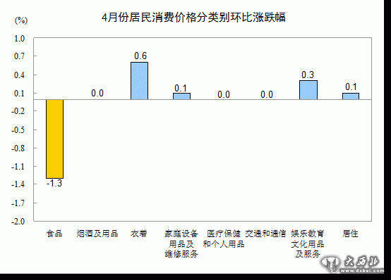 4月份,全国居民消费价格总水平环比下降0.3%。其中,城市下降0.3%,农村下降0.4%;食品价格下降1.3%,非食品价格上涨0.2%;消费品价格下降0.6%,服务价格上涨0.2%。