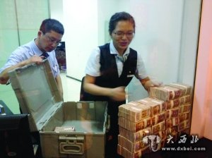 在银行保安的帮助下,这些钱被搬到银行柜台前。里面一位工作人员接应,每一捆经窗口送到里面,再整整齐齐靠窗玻璃码好。