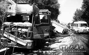 6月29日10时28分,陇南市消防支队成县中队接陇南119指挥中心调度称,在位于成县至武都方向距收费站约500米处的道路上,一辆大卡车因刹车失灵撞向路边护坡。剧烈地撞击导致卡车车体严重受损,车上载着的变压器发生侧翻,造成大量油品外泄。10时50分,消防队员到达现场后发现,事故卡车的一侧陷入路边的排水沟内,车上的变压器翻在公路上,大量的油品泄露,附近1公里多长的路面已经完全被油品所浸湿。