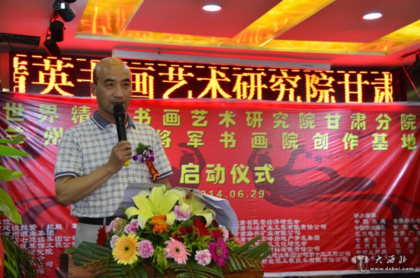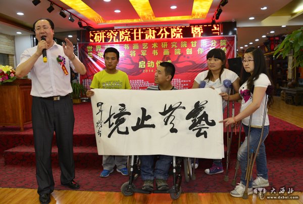 2014年6月29日下午,“世界精英书画艺术研究院甘肃分院”暨“兰州军区将军书画院创作基地”启动仪式在兰州敦煌梦艺术馆正式挂牌成立,甘肃省近百位书画精英携带作品到场祝贺。与此同时,多名爱心人士慷慨解囊,为兰州“心翼残疾人爱心书画社”的残疾孩子们捐款5100元。