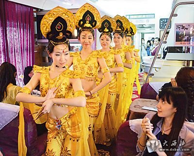 大西北网7月11日讯:据新华社消息,7月10日,600多名旅客在兰州火车站登上首发的兰州至敦煌Y667/8次“敦煌号”品牌旅游列车出行。图为身穿敦煌元素服装的列车员们在表演。