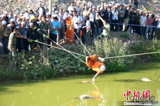 在公安民警现场取证后,消防救援人员展开救援。由于池塘内淤泥过深,为确保救援人员自身安全,指挥员命令将30米安全绳的一端固定在池塘对面的电线杆上,另一端由消防官兵及当地群众拉起,一名战斗员着救生衣,佩戴安全腰带,利用挂钩悬挂于30米安全绳上,人为控制绳索高度,使战斗员能够顺利将遗体拨到岸边。