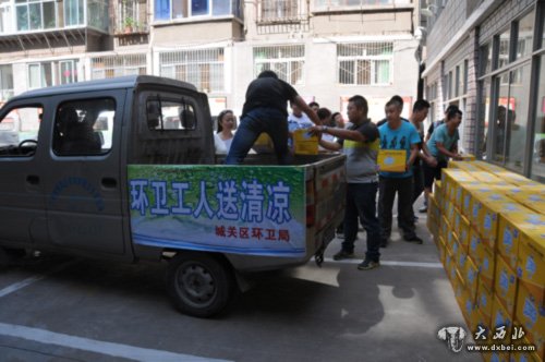 据了解,每年夏季高温天气,城关区市容环卫局都会采取一系列的防暑降温措施,不仅为一线环卫职工发放绿茶、菊花茶、玫瑰、冰糖,以及绿豆汤等防暑品,而且在超过35℃的高温天气购买矿泉水、饮料发放给一线环卫职工。仅2013年夏季,共送出矿泉水、饮料近70000瓶。今年,截至目前共向一线职工发放矿泉水、饮料近25000瓶,仅7月29日一天就发放2700余瓶。据悉,此次“送清凉”工作还将继续进行,直到高温天气结束为止。(更多内容请点击大西北网ttp://www.dxbei.com/)