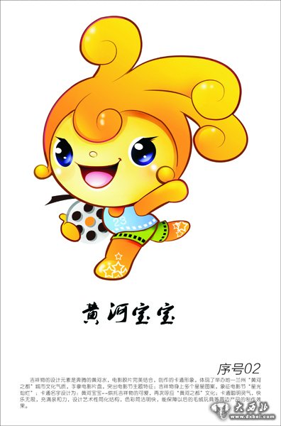 本届电影节吉祥物一等奖获得者是2号参赛作品的“黄河宝宝”,是由黑龙江省木兰县的王波设计的。“黄河宝宝”是由奔腾的黄河水与电影胶片组成的,体现了举办地——兰州“黄河之都”城市文化气质,手拿电影片盘的形象也突出了电影节主题特征;吉祥物聪明灵气,快乐无限,充满亲和力,设计艺术性简化结构,色彩简洁明快,身上多个星星图案,象征电影节“星光灿烂”,很好的体现了本届电影节的地域特色、文化特色和时代特色。