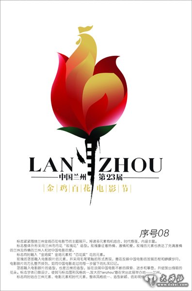 此外,本届电影节LOGO标识一等奖的获得者是8号参赛作品,是由陕西省西安市郑寿超设计的,标识整体外形采用兰州市市花“玫瑰花”为造型。玫瑰的茎部融入电影胶片的元素,并采用毛笔笔触的形式表现,意在反映中国电影的发展历程,电影胶片的方孔整齐排列,如同中国电影留下的扎实印记。底部云梯的造型更是象征着中国电影不断的探索、进步和攀登,并绽放出绚丽的花朵。热情的玫瑰也表达了充满激情的兰州及热情的兰州人和对中国电影的爱。字体LANZHOU意在突出此届举办地,整个标识同时结合兰州元素、电影元素和时代元素,整体风格统一、造型新颖、色彩明快。