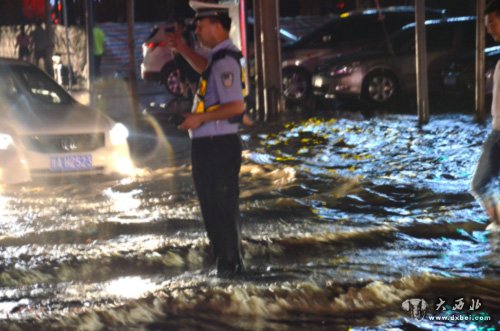 大西北网讯 7月29日晚20:40许,一场突如其来的大暴雨,短时间内使整个中心城区陷入一片汪洋之中。东岗交警大队辖区盘旋路、农民巷、五里铺、铁路局、邮电大楼等道路多条路段积水严重,造成大面积的交通拥堵。东岗大队迅速启动“暴雨天交通管理应急预案”,调动各中队警力共计70多余人,投入到辖区拥堵路段展开指挥疏导,重点加强对涉水较深路段外围的车辆分流。民警、协警冒雨指挥交通,推移多辆熄火抛锚车辆。截至凌晨1时辖区道路才恢复正常通行。