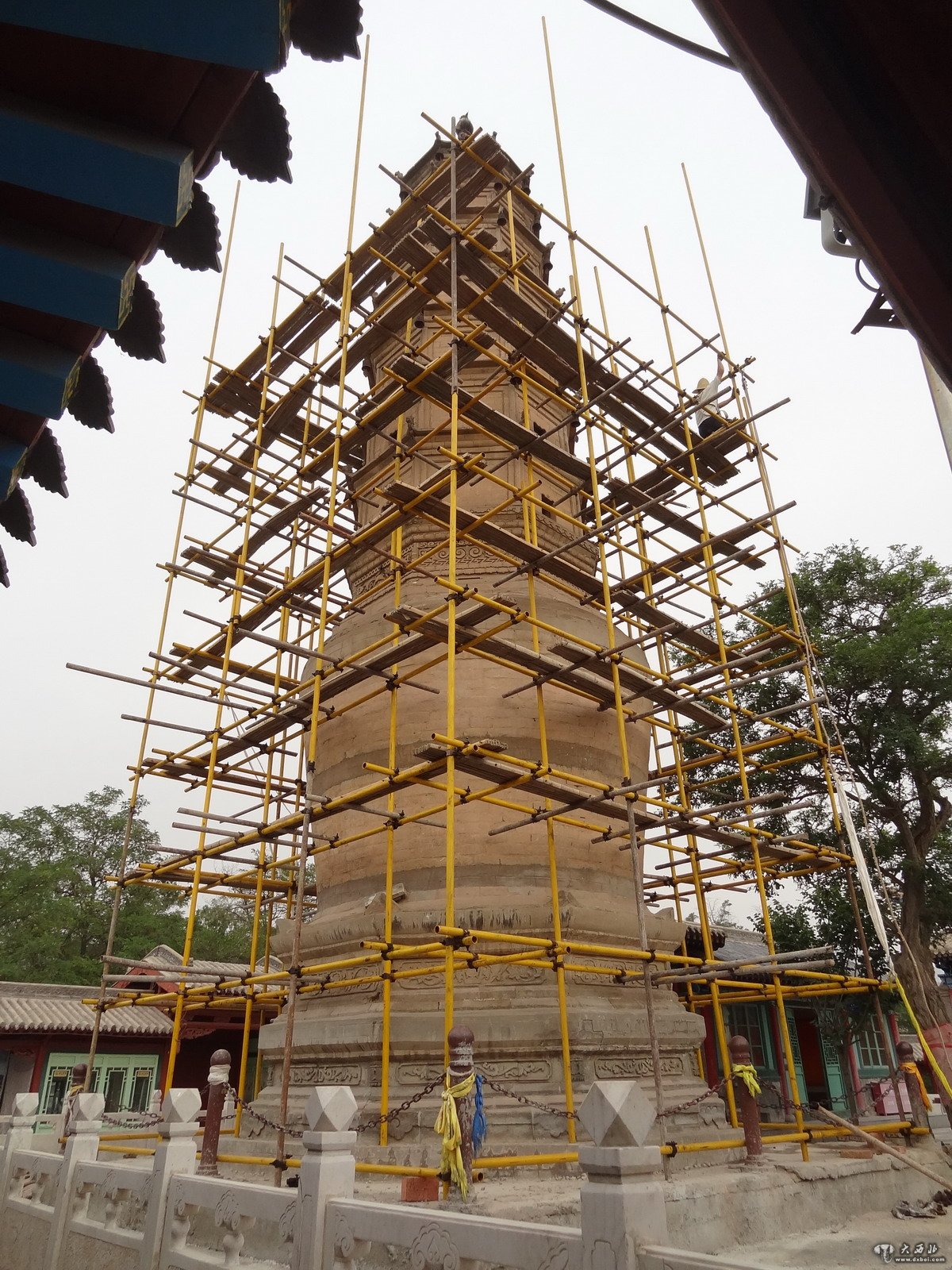 7月31日,兰州白塔山白塔寺内工人正在为白塔维修架设脚手架,白塔开始修缮。据施工方甘肃兴城建筑工程有限公司经理龚真信介绍:本次白塔修缮工程包括塔身倾斜矫正、塔身破损砖块的更换,风铃的更换等项目,维修工期3个月,预计10月完工。