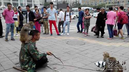 大西北网讯 一只猴子被耍猴人用皮鞭打急了,竟跳到耍猴人的肩上,揪住头发不放,疼得耍猴人“嗷嗷”大叫,惹得围观群众哈哈大笑。耍猴人说:其实猴打人是他们通过多年训练出来的“看家节目”。昨日早上,记者在天水路的人行道上目睹了这一场别样的“猴戏”。