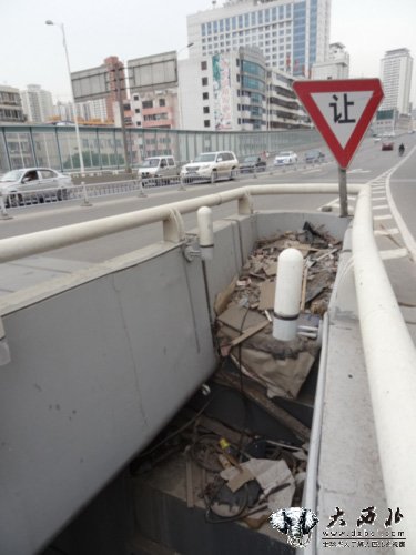 在兰州市小西湖黄河大桥南滨河路西南匝道的岔口竖着一块交通标志“让”,此牌意为:减速让行。而在这块交通标志下却堆满了垃圾,让道标志下成了“让倒垃圾”。这些垃圾悬在路人的头顶,既不安全又不卫生,希望有关部门予以清理。