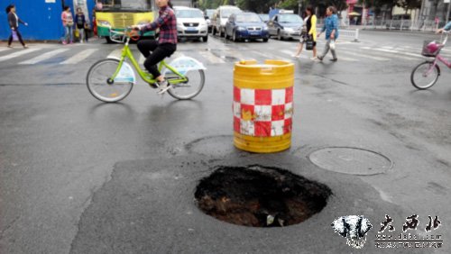坑洞而过,场面险象环生。希望相关部门能引起重视,尽快对坑洞进行修补。