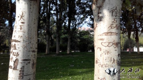 进入秋季,绿树成荫,公园、黄河边成了兰州市民的好去处。然而,昨日记者在风情线采访时发现,黄河岸边挺拔俊健的白杨树,许多被人涂鸦毁容,树身上被刻下“我爱你”、“友谊地久天长”等字样,有的树木甚至被剥掉树皮,令人惨不忍睹。