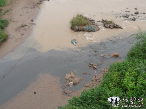 8月21日兰州七里河的这条小河道的污水流入黄河,在雨天里,黑色的污水和黄河的水形成了鲜明的对比,可谓“泾渭分明”。