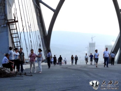 8月22日,深安黄河大桥桥面柏油铺设完成,傍晚,家住兰州市安宁的市民相继踏上大桥观看、欣赏这座新建的大桥的风采和黄河两岸风光。