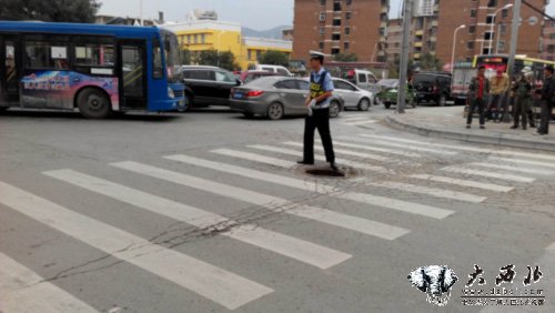 大西北网讯 昨日早上,兰州市雁滩安居小区西出口十字路口一个窨井没了盖子,被正在执勤的交警发现。为避免市民和车辆发生危险,他守候在窨井旁近半小时。