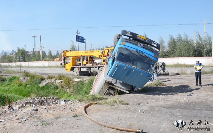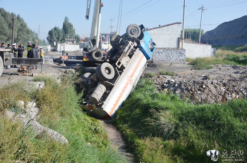 大西北网9月2日讯 近日,永登交警大队民警在辖区路面进行日常巡查,行经国道312线2241km处时,发现一辆车号为甘A5031*、拉运危险化学品的油罐车翻倒在路边3米深的水沟中。油罐车驾驶人蒲某正组织吊车进行私自吊装,罐体有油污溢出。经询问驾驶人罐体内装有12吨0号柴油,现场情况比较危险,巡逻民警立即向永登交警大队汇报,并联系消防部门。在消防官兵的协助下,成功处理了此次事故。