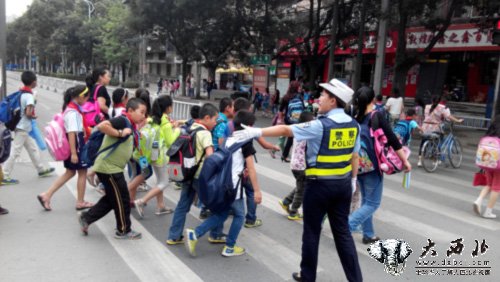 随着车辆日趋增多,小学生过马路的安全隐患也相应增加。昨日,记者在兰州市西站敦煌路丁字路口看到,交警在这个路口专门设置了“护学岗”,在小学生上放学时间,都安排“马路使者”开展护送活动,确保小学生过马路的人身安全。