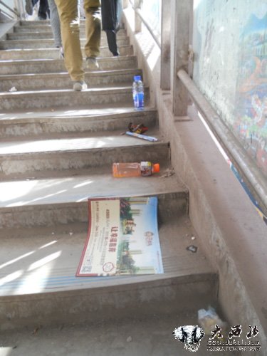 接完读者电话记者立即赶到西站快速公交过街天桥,从1路车西站终点站下车步行几十米就来到西站十字,往北看去一座宏伟过街天桥横跨道路两侧,设计独特的过街天桥让西站十字增添了魅力。可刚跨入南侧台阶就看到满地的垃圾,有机玻璃围栏上到处喷着黑色小广告,这与方才从外面看到的美好形象形成鲜明的对比。记者沿着台阶慢慢向上走去,看到几乎每个台阶都有垃圾,有意思的是一个台阶立放着一个饮料瓶,下面又横躺着一个饮料瓶,两个饮料瓶的上下台阶上分别又有一根棍子和一张广告宣传单,给人感觉好像是有人设置得扔竹圈场地。再看天桥两侧有机玻璃被广告涂抹的乱七八糟。台阶旁边自动电梯没有使用,人们走到电梯上边一道塑料篷布横在路中,无奈行人只能“绕道”行走。