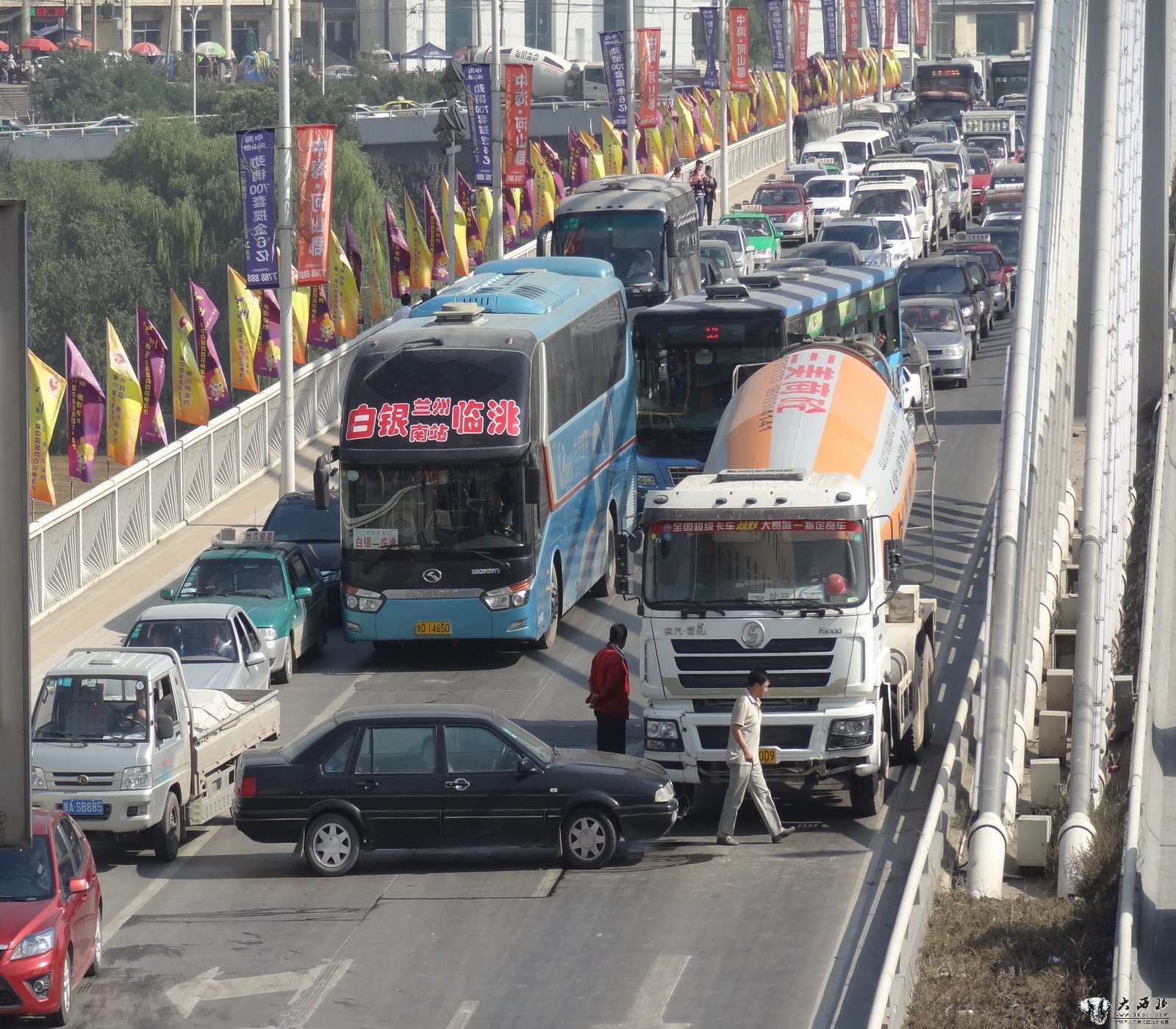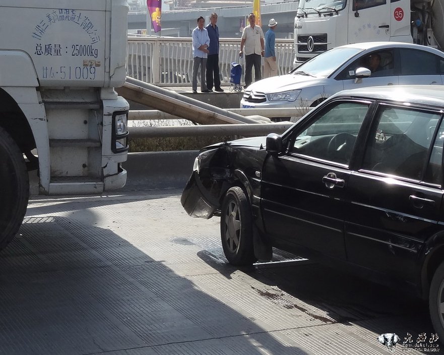 9月4日上午,小西湖黄河大桥一辆罐车与一桑塔纳相撞,桑塔纳横在了马路中间,车头严重受损,造成黄河大桥堵车长达一小时左右。
