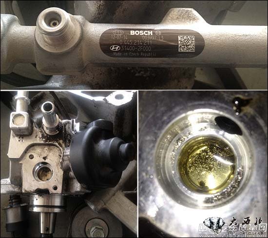据车主反映,车辆行驶中熄火,经4S店检查发现柴油高压泵、高压共轨、喷油嘴全部损坏。上图为索兰托所使用的博世高压供油系统,将阀体拆下后,从图中可清晰地看到其内部有大量的金属碎屑。