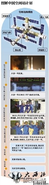 根据计划,中国将于2016年前后发射天宫二号空间实验室,随后发射神舟十一号飞船及与之对接的天舟一号货运飞船,2018年前后发射试验核心舱,2022年前后完成空间站建造。