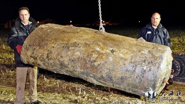 图为席泽市发现的巨型炸弹,外型上呈圆柱体。