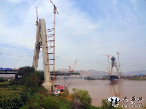 兰州(新城)至永靖黄河快速通道的重点桥梁工程,河口黄河特大桥由于桥墩全部建在河岸上,不但有利于环保,而且还不影响河道的通航。该桥两个主塔高99米,最大跨径360米,直跨黄河两岸。该主桥为双塔斜拉桥,跨径布置为:(177+360+177)m,桥塔采用钢筋混泥土A型塔,塔高99m,主梁采用工字钢-混泥土结合梁,梁高2.83m,桥面宽26m,大桥引桥采用预应力混泥土简支箱梁与连续梁组合桥,桥面宽23m,设计车速为60km/h。合同期为32个月。