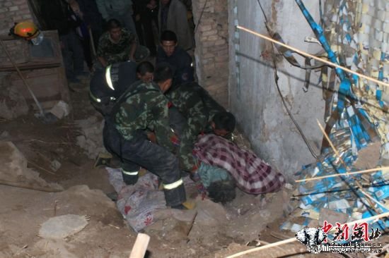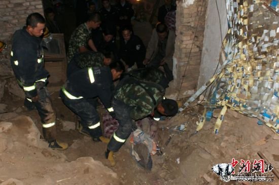 大西北网9月20日讯 2014年9与18日,甘肃省平凉市崆峒区发生山体滑坡,山脚下一房屋被泥土掩埋,2名群众被埋身亡。图为消防官兵救援现场。中新社发 陈兴玉 摄