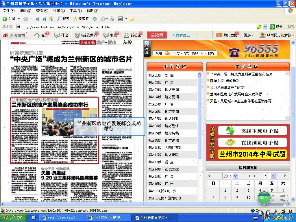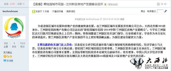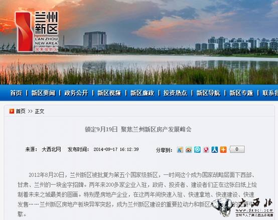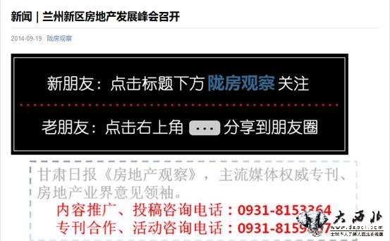 在9月19日“碧桂园·城市花园2014中国·兰州新区房地产发展峰会”召开当日,兰州新区官网、腾讯房产、大西北网新浪官博、微信在清晨就发布了《兰州新区房产发展峰会今日举行》的预告消息;腾讯兰州、大西北网新浪官方微博、兰州365房微信对峰会进行了全城直播,让大众在第一时间对峰会的内容、专家学者对新区的讲解有了了解。