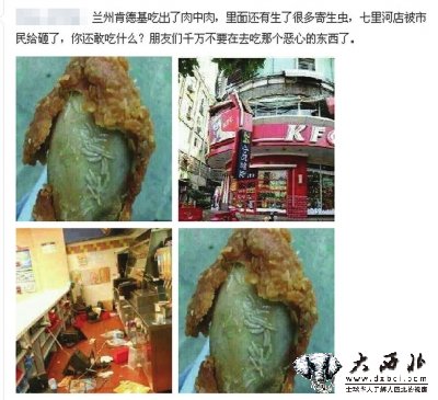 大西北网9月26日讯 9月25日上午,微博、微信、甚至是QQ空间,出现了内容相似的一则有关于兰州七里河肯德基店的消息。消息称:在兰州七里河肯德基店的炸鸡腿里吃出虫子,并且,七里河肯德基店被市民给砸了。除了文字以外,该内容还被附上了图片,这让不少市民信以为真。但事实究竟是怎样的?记者前往兰州七里河肯德基店了解情况。