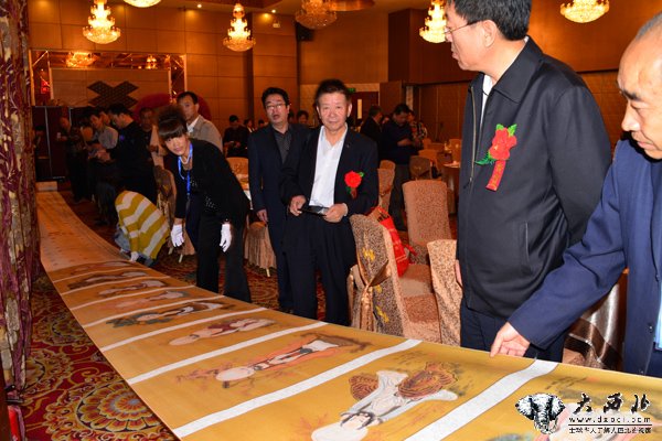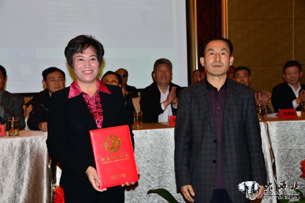白鹏飞为王淑萍颁发世界记录篆刻《金刚经》百米长卷证书。 贾笑云 摄