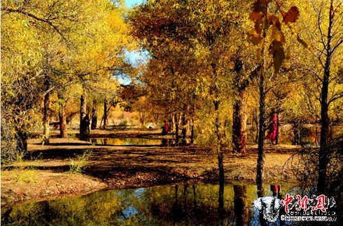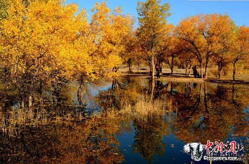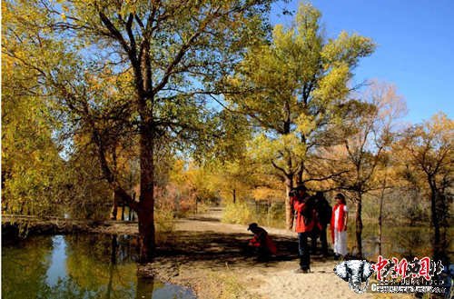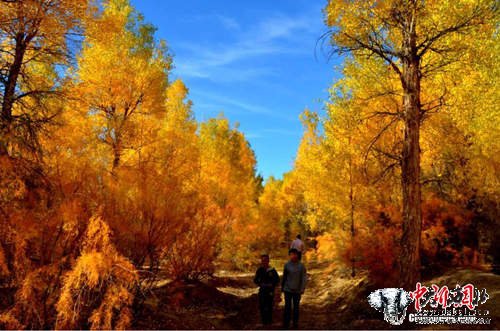 大西北网讯 金秋10月,成片的胡杨林把甘肃金塔森林公园装扮的美丽如画,树枝上一片片金黄色的树叶,古老的杨树,湛蓝的天空与秋色的胡杨林相映相成,显得格外壮观美丽。金塔县胡杨林周边分布着大面积的沙枣树、白杨树和红柳等西北特色树种,总面积达8万亩。该胡杨林分布密集,长势良好。