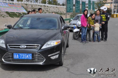 大西北网讯 10月4日上午11时许,高速交警第一支队盐场堡大队国庆安保摩托车小分队民警尚瑞杰、石鑫执行巡逻任务时,发现在辖区G30高速距兰州北出口100米距离处,停有一车辆黑色小轿车,下面站着一名四、五岁的小孩,由于在对向车道,车流量很大,非常危险,民警立即用喊话器提示驾驶人马上驶离,但发现对方没有任何反应,民警只好从服务区调头准备前往纠正。