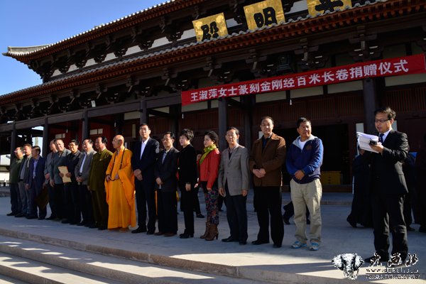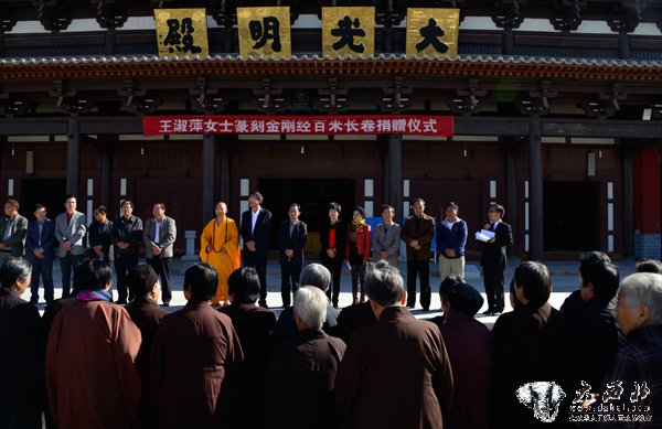 王淑萍在发言中说:“我将自己用巨资打造的篆刻《金刚经》百米长卷捐赠给雷音寺,就是要让曾经失去《金刚经》长卷重新回到敦煌的怀抱里,从而找回敦煌儿女的尊严,让篆刻《金刚经》百米长卷续写敦煌灿烂历史文化的新的辉煌。”