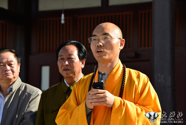 雷音寺方丈道正法师在百米篆刻《金刚经》捐赠仪式上讲话。 贾笑云 摄