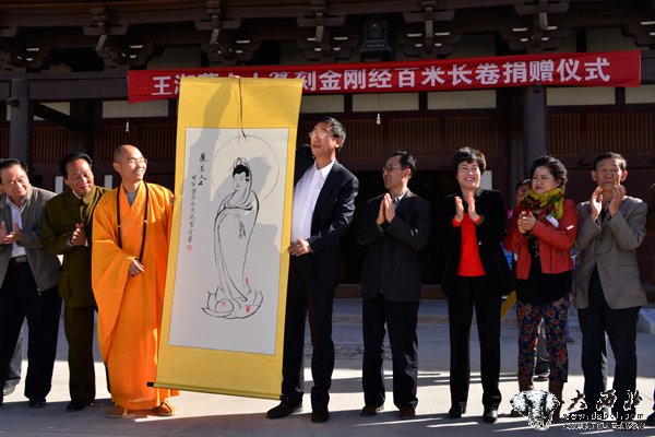 捐赠人王淑萍将篆刻《金刚经》百米长卷,亲手郑重地交给雷音寺方丈道正法师。当人们在阳光下将篆刻《金刚经》百米长卷徐徐展开的时候,十八罗汉画像、上千枚篆刻印章、7000多字的楷书书法和镶嵌在其间的释迦摩尼佛像、小观音像赫然在目,引起现场一阵阵热烈的掌声和喝彩声。
