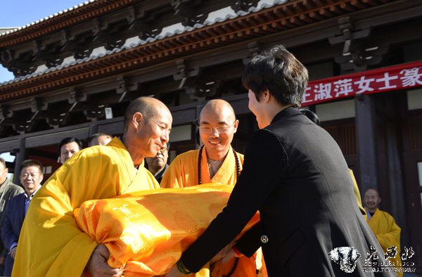 王淑萍亲手把篆刻《金刚经》百米长卷捐赠给雷音寺方丈道正(中)法师手中。 贾笑云 摄