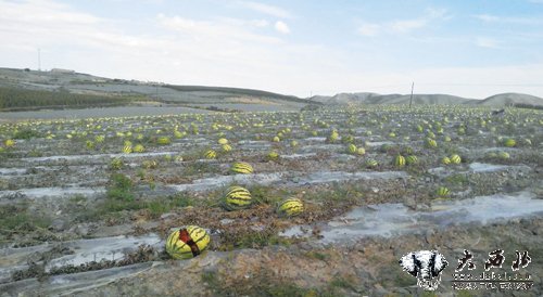 据周宇国介绍,今年3月底,他和其他瓜农一样,到镇上的福利门市部购买了近年较为流行的一种名为“丰抗8号”的西瓜种子,可是不知为何别人的瓜种出来都好好的,自己的西瓜长出来却成了这个样子,随后周宇国将此事向靖远县农牧局做了反映,经调查发现,他购买的种子竟然是假种子。由于去年遭遇了旱灾,周宇国颗粒无收,本想着今年雨水多,天气好,可以有个好收成,也好还了去年的欠债,可是没想到却遇上了假种子。由于瓜的品相太差,没有瓜贩子愿意收购,只得眼看着这些西瓜烂在地里。